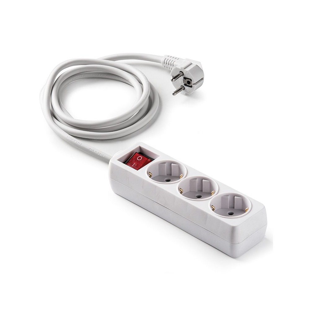 · Regleta / Base de enchufe múltiple de 3 tomas schuko, interruptor luminoso de corte y cable prolongador de 1,5 metros de longitud.