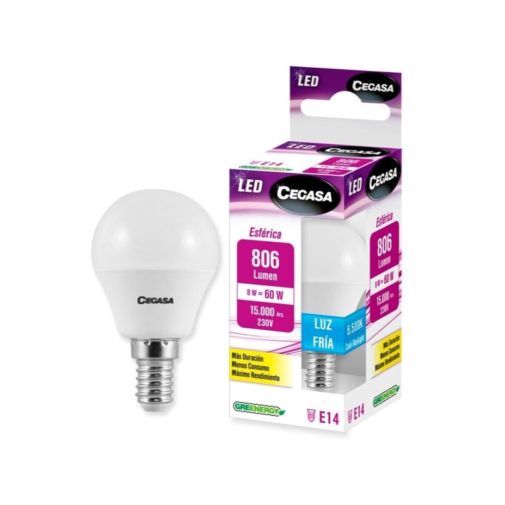 BOMBILLA LED ESFÉRICA E14 8W FRÍA 6500K 806LM CEGASA